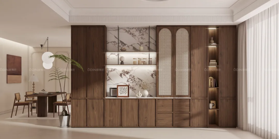 而色彩斑斕的巖板,不僅作為背板,更是作為臺面使用。巖板的質地堅硬、色彩豐富,讓整個餐邊柜的格調(diào)瞬間提升。無論是擺放餐具、擺放裝飾品都能展現(xiàn)出獨特的魅力。
