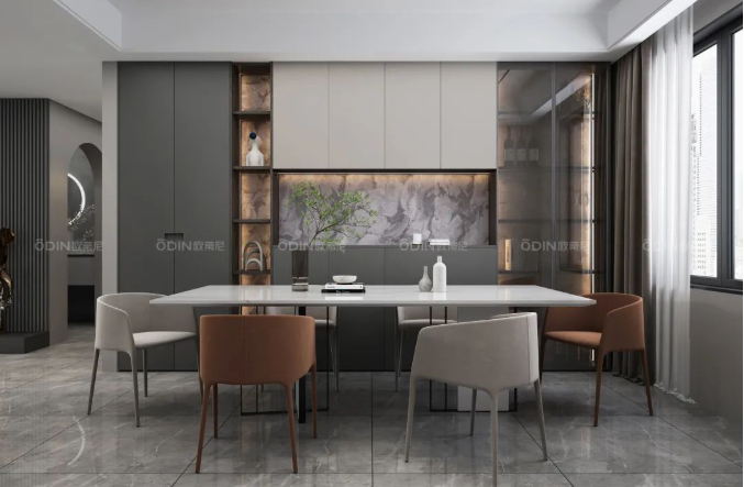 開放格搭配隱藏式的燈帶設(shè)計,加上簡潔的餐桌、皮質(zhì)的餐椅、溫馨的燈光,以及裝飾品、綠植的點綴,增強(qiáng)用餐時的儀式感,也讓家該有的質(zhì)感和溫馨得以展現(xiàn)。