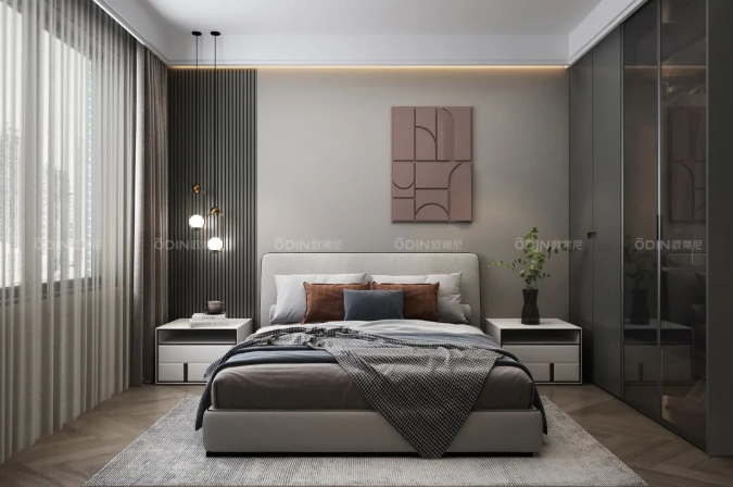 當(dāng)自然光線透過薄紗窗簾照射進(jìn)來自然通透,空間覆上溫暖的舒適感。作為日常睡臥之居,更顯靜謐和沉穩(wěn)。